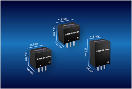 所有R-78K系列型號均具有欠壓鎖定和自動恢復(fù)的短路保護(hù)功能,僅需簡單的輸入濾波器即可滿足EMC標(biāo)準(zhǔn)EN 55032 B類規(guī)范。額定電流為0.5A和1A的版本采用SIP-3微型封裝,占位面積11.5 x 7.55mm,高10.2mm;2A版本則為11.5 x 8.5mm,高17.5mm,同樣采用SIP-3封裝。
