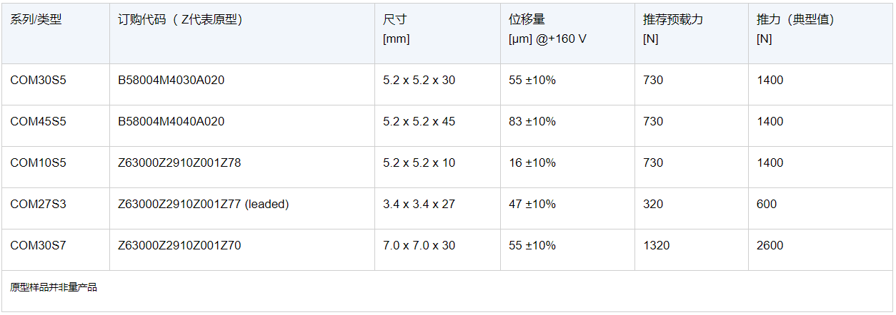 此外,TDK計(jì)劃于2023年再推出另外三款執(zhí)行器,以滿(mǎn)足更廣泛的應(yīng)用要求。目前,這些執(zhí)行器僅作為少量原型樣品供應(yīng),尚未量產(chǎn),具體包括高度為10 mm、位移量為16 μm的COM10S5;高度為27 mm、位移量為47 μm的COM27S3(帶引線(xiàn)型);以及高度為30 mm、橫截面為7 mm x 7 mm、位移量為55 μm、推力高達(dá)2600 N的COM30S7。