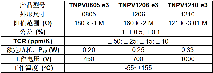 TNPV e3系列電阻外形尺寸分別為0805、1206和1210,阻值為121 k至3.01 M,工作溫度-55 C至+155 C、最大外形尺寸器件工作電壓最高可達(dá)1,000 V。電阻在各種環(huán)境條件下非常穩(wěn)定可靠,額定功率和+70 °C環(huán)境溫度下,1,000小時最大電阻變化率≤ 0.05 %,具有優(yōu)異的防潮性(85 °C,85 %相對濕度),耐硫能力符合ASTM B 809規(guī)定。