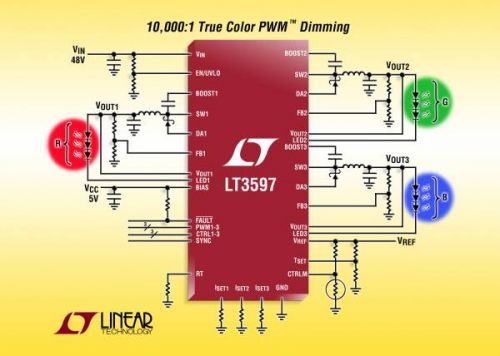 LT3597 采用 3 個獨立的 400mA、60V 內(nèi)部開關(guān),以提供降壓型恒定電流源。內(nèi)部降壓型轉(zhuǎn)換器運(yùn)用自適應(yīng)反饋環(huán)路調(diào)節(jié)輸出電壓,使其略高于所需要的 LED 電壓,以確保最高效率。如果任何一串 LED 串出現(xiàn)了開路或短路故障,那么 LT3597 就繼續(xù)調(diào)節(jié)其它 LED 串,并向 FAULT 引腳發(fā)出信號。其他特點包括基于節(jié)溫和 / 或 LED 溫度使 LED 電流降額以及在停機(jī)時斷接 LED。