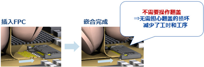 傳統(tǒng)的FPC連接器需要先翻蓋,再插入FPC,最后關(guān)上翻蓋才能完成操作,但操作失誤會(huì)使翻蓋脫落。近些年板對(duì)FPC連接器主要被用于智能手機(jī)和可穿戴設(shè)備等產(chǎn)量大的小型設(shè)備的內(nèi)部連接。但是,板對(duì)FPC連接器需要讓安裝在FPC上的連接器和安裝在基板上的對(duì)側(cè)連接器嵌合連接,因此,嵌合高度尺寸會(huì)比單片結(jié)構(gòu)的低薄FPC連接器高,在不斷追求輕薄的移動(dòng)消費(fèi)類設(shè)備中無法被應(yīng)用。在這種情況下,需使用更薄的FPC連接器。