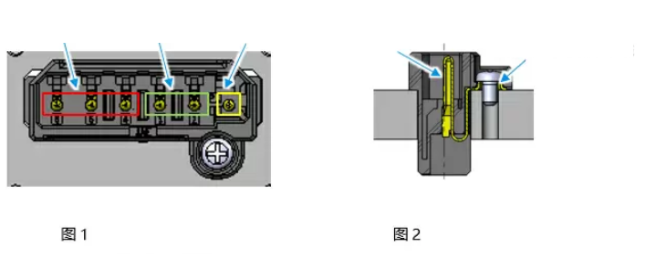 插座和插頭的嵌合實現(xiàn)了鎖螺絲固定外殼的簡略固定構(gòu)造,不僅實現(xiàn)了連接器的小型化,低背化,也實現(xiàn)了高連接性能與高防水性能。固定的同時電氣上連接接地端子和金屬外殼的構(gòu)造(圖2),在組裝連接器的同時,也可以很容易地進行外殼的接地連接。